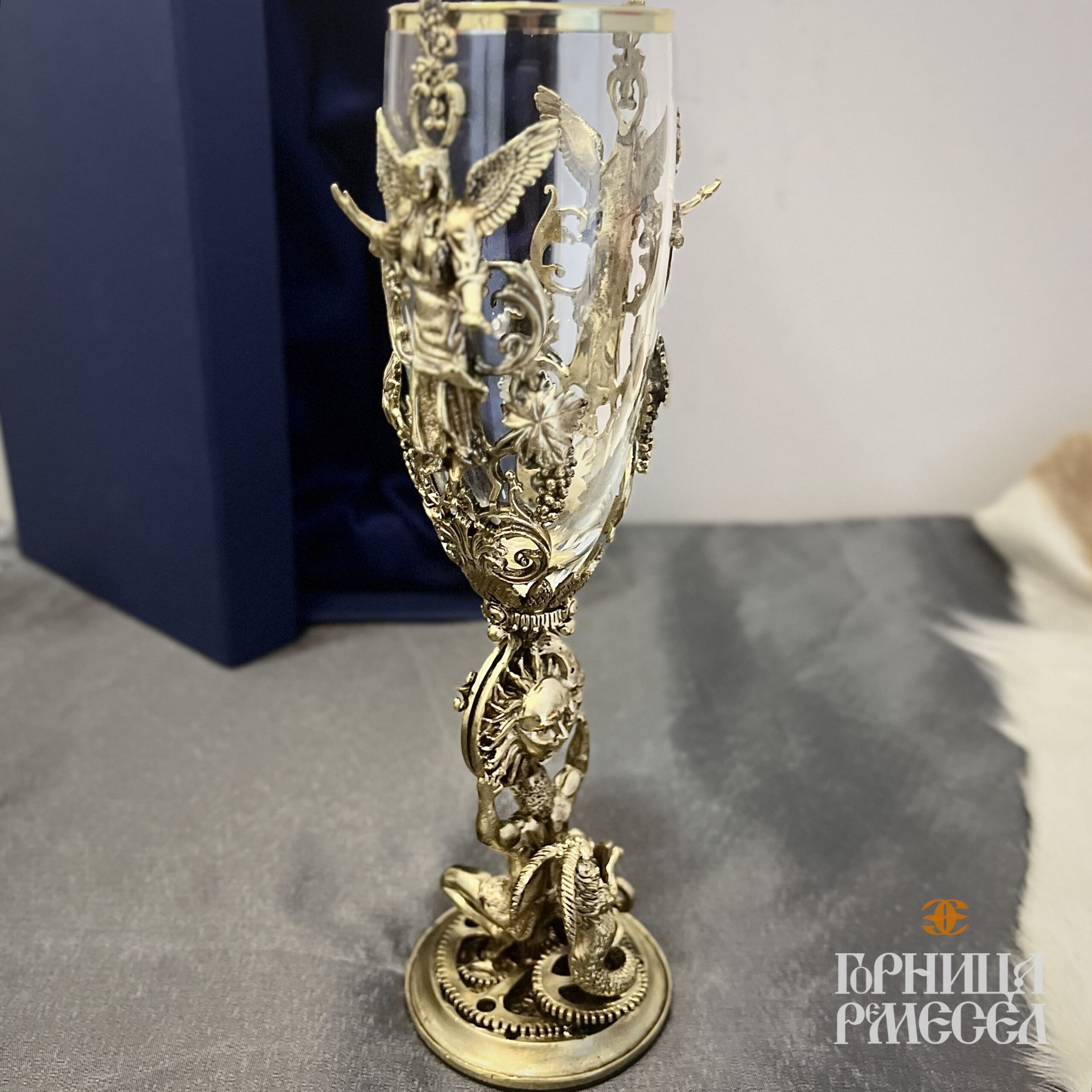Бокал для вина «Зодиак Козерог», 180 мл. Закалённое стекло, патинированная латунь, нитрид‑титановое покрытие. Ручная работа, художественное литьё знака Козерог.