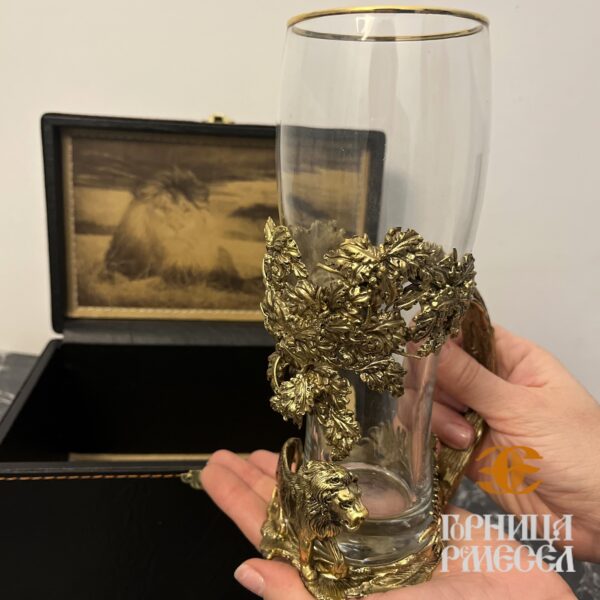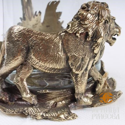 Подарочный бокал «Лев» — это не просто посуда, а настоящее произведение искусства. Выполнен в технике точного художественного литья под вакуумом, он сочетает в себе силу металла и прозрачную красоту стекла. Ручка в форме дерева, обвитого царём зверей — львом, создаёт эффект живой скульптуры. Внутренняя часть кожаной упаковки оформлена гравировкой саванны — символического места обитания льва. Сам бокал изготовлен из высокопрочного стекла с элегантным золотым ободком.