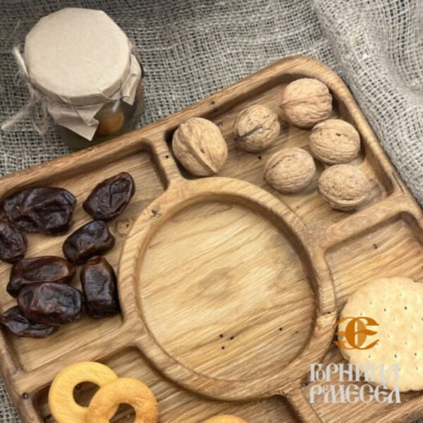 Каждая менажница обработана льняным маслом, что не только подчеркивает текстуру и красоту древесины, но и обеспечивает дополнительную защиту. Благодаря пяти глубоким секциям, Вы сможете удобно разместить разнообразные закуски, орехи, фрукты или сладости, создавая привлекательные и функциональные сервировки для Ваших гостей.