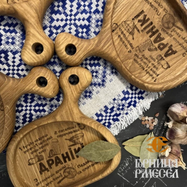 Характеристики: Натуральное дерево (дуб) — экологически чистый и безопасный для здоровья. Льняное масло — придает древесине великолепный блеск и защищает ее от влаги и загрязнений. Диаметр 14 см, толщина 2,5 см — идеальные габариты для сервировки блюд и закусок. Уникальный орнамент, изображающий рецепты белорусской кухни — это не просто украшение, а настоящая дань уважения к кулинарным традициям страны.