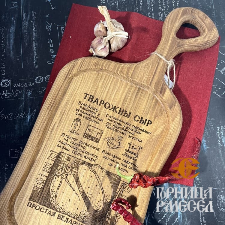 Характеристики: Натуральное дерево, дуб, что обеспечивает долговечность и надежность изделия. Льняное масло, придающее поверхности красивый блеск и защищающее дерево от влаги. Размеры: Ширина 24 см, длина 50 см, толщина 2,5 см — идеальные пропорции для удобства использования. Оригинальная гравировка с рецептами белорусской кухни, которая добавляет уникальности и культурного колорита. Отлично подходит для подарков, а также для мероприятий, где Вы хотите подчеркнуть национальный колорит и атмосферу домашнего уюта.