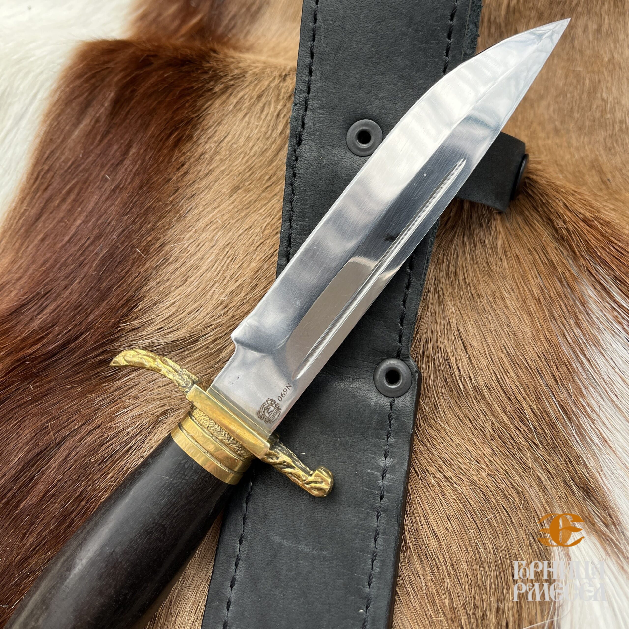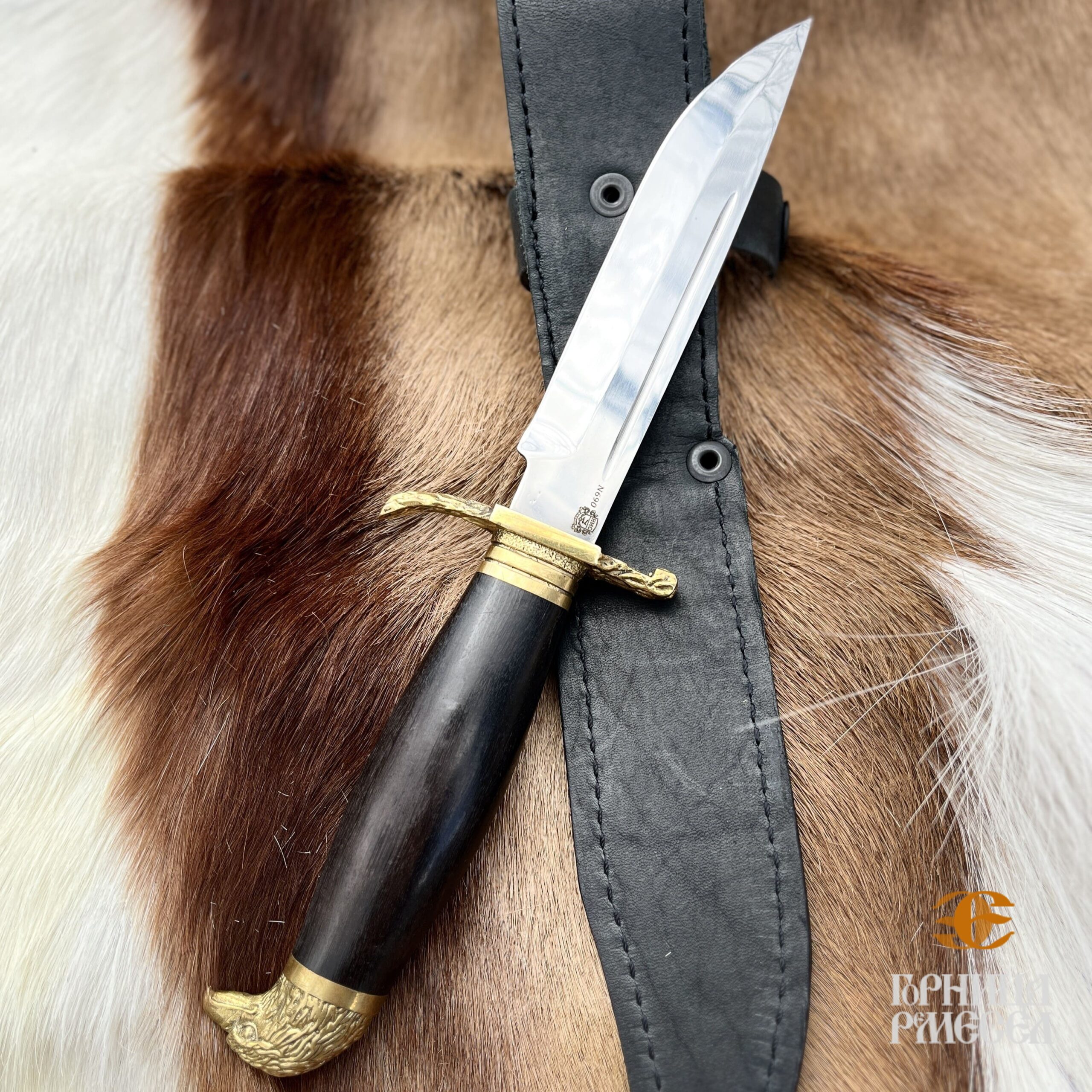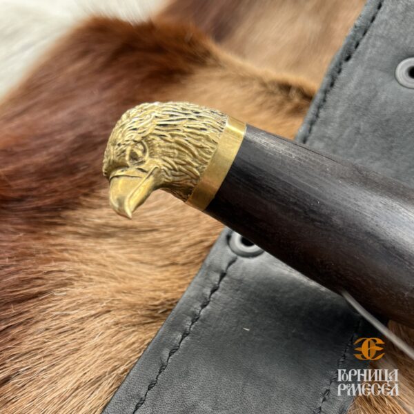 Нож очень простой, легкий и в то же время мощный, имеющий отлаженную в течение времени конструкцию, удобный и универсальный, подходящий для самой разной работы. Рукоять выполнена из граба, а главная красота заключается в художественном литье из латуни — голова орла. В комплекте чехол из натуральной кожи. Данный нож является ножом разделочным, не относящимся к холодному оружию и не требует специального разрешения.