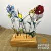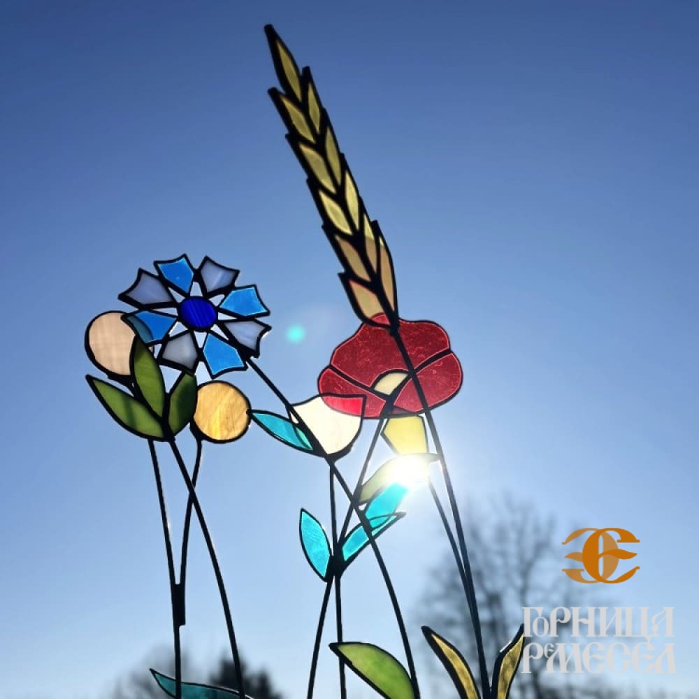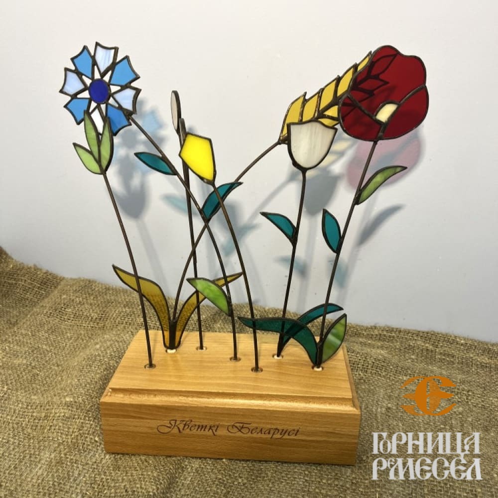 Авторская композиция из цветного стекла, выполненная в технике витража Тиффани, — это не просто сувенир, а настоящее декоративное произведение искусства. Семь витражных элементов — цветы и колосья, символизирующие природную красоту и плодородие белорусской земли — соединены в гармоничную композицию на деревянной подставке с гравировкой «Кветкі Беларусі» на родной мове.