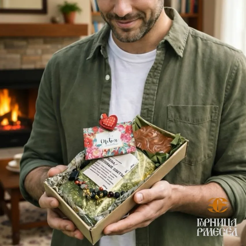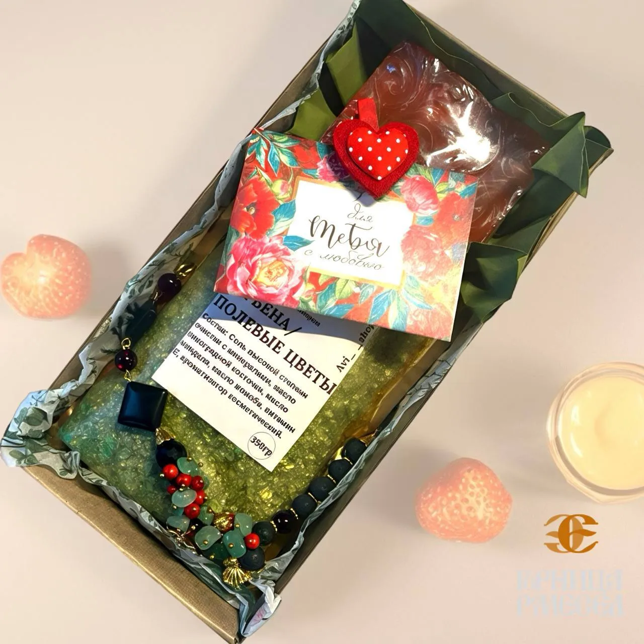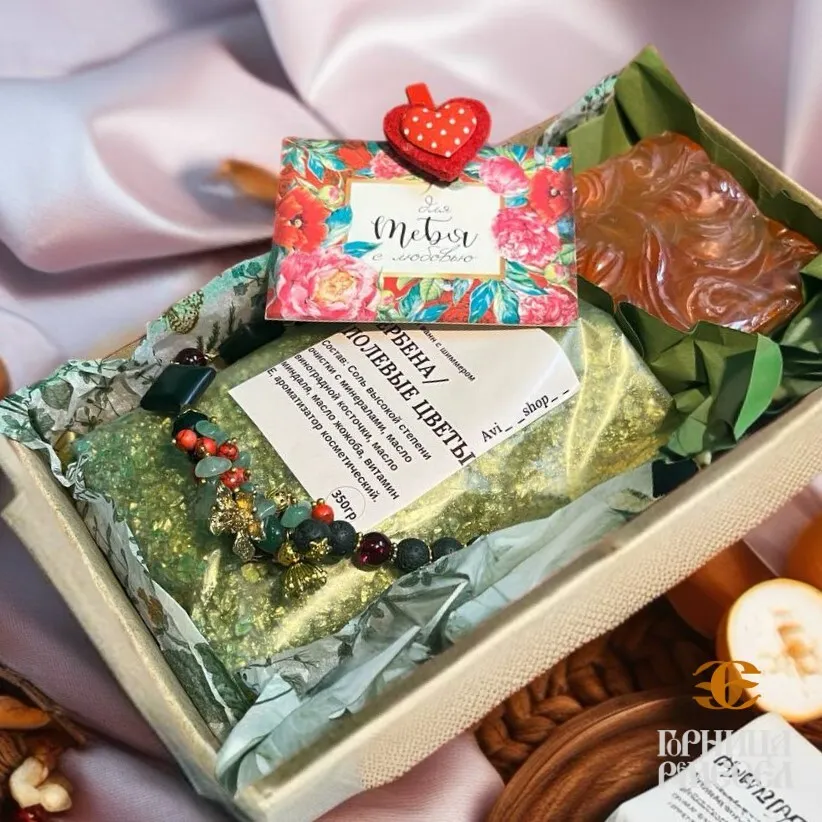 «Карнавал ощущений» — это не просто подарочный набор, а путешествие в мир натуральных текстур и ярких эмоций. Нежная соль с мерцающим шиммером и роскошное мыло с природными маслами подарят коже заботу и сияние. Косметический шиммер и ценные масла (ши, виноградной косточки) дополнят ритуал ухода. Венчает набор уникальный браслет «Карнавал» — ручная работа из вулканических камней, красного говлита и дерева, которая добавит образу нотку праздника и гармонии. Идеальный подарок для тех, кто ценит натуральность, эстетику и детали.