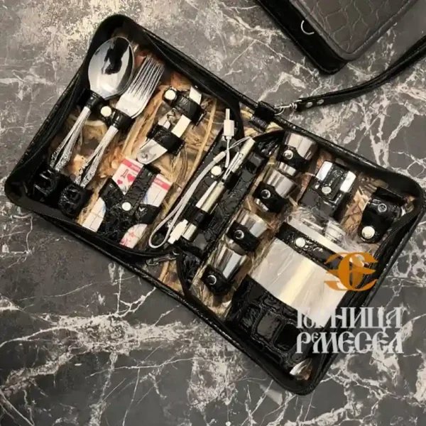 Практичный и стильный дорожный набор на 3 персоны — идеальный спутник для путешествий, охоты, рыбалки, туризма и активного отдыха. Барсетка выполнена из искусственной кожи, украшена декоративной картиной, внутренняя отделка — ткань. Все аксессуары изготовлены из нержавеющей стали и надёжно закреплены внутри. Компактный размер позволяет легко брать набор в дорогу, а удобный ремешок делает переноску комфортной.