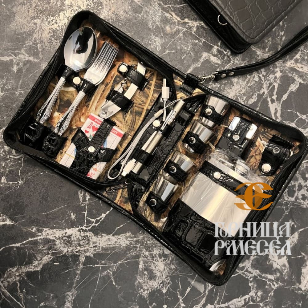 Оригинальный дорожный набор на 4 персоны (с картиной) в компактной барсетке — стильный и практичный подарок для мужчин, охотников, туристов и любителей активного отдыха. Компактный несессер с флягой, стопками, ножом и аксессуарами идеально подходит для путешествий, пикников, охоты и рыбалки. Производитель ООО «Вэлс», Нижний Новгород. Возможность корпоративного нанесения рисунка от 15 наборов. Все предметы надёжно закреплены внутри, что делает использование удобным и безопасным.