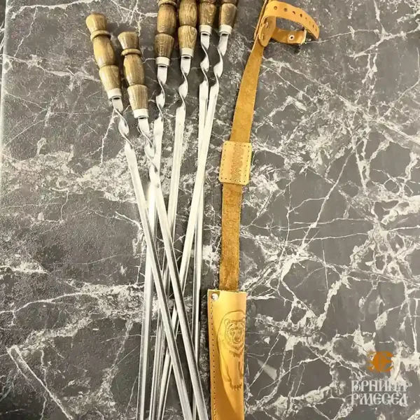 — 6 шампуров из нержавеющей стали: шампуры общей длиной 67 см, длина лезвии 55 см., толщина лезвии 3 мм с деревянными ручками, идеально подходят для приготовления различных блюд на мангале — от классического шашлыка до люля на шампурах или картошки на мангале;