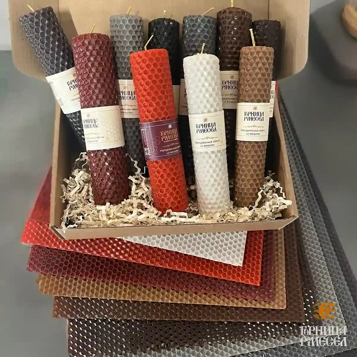 | Состав набора | • 10 листов вощины (20×13 см) • 2 метра вощеного фитиля • Инструкция • Крафтовая упаковка |