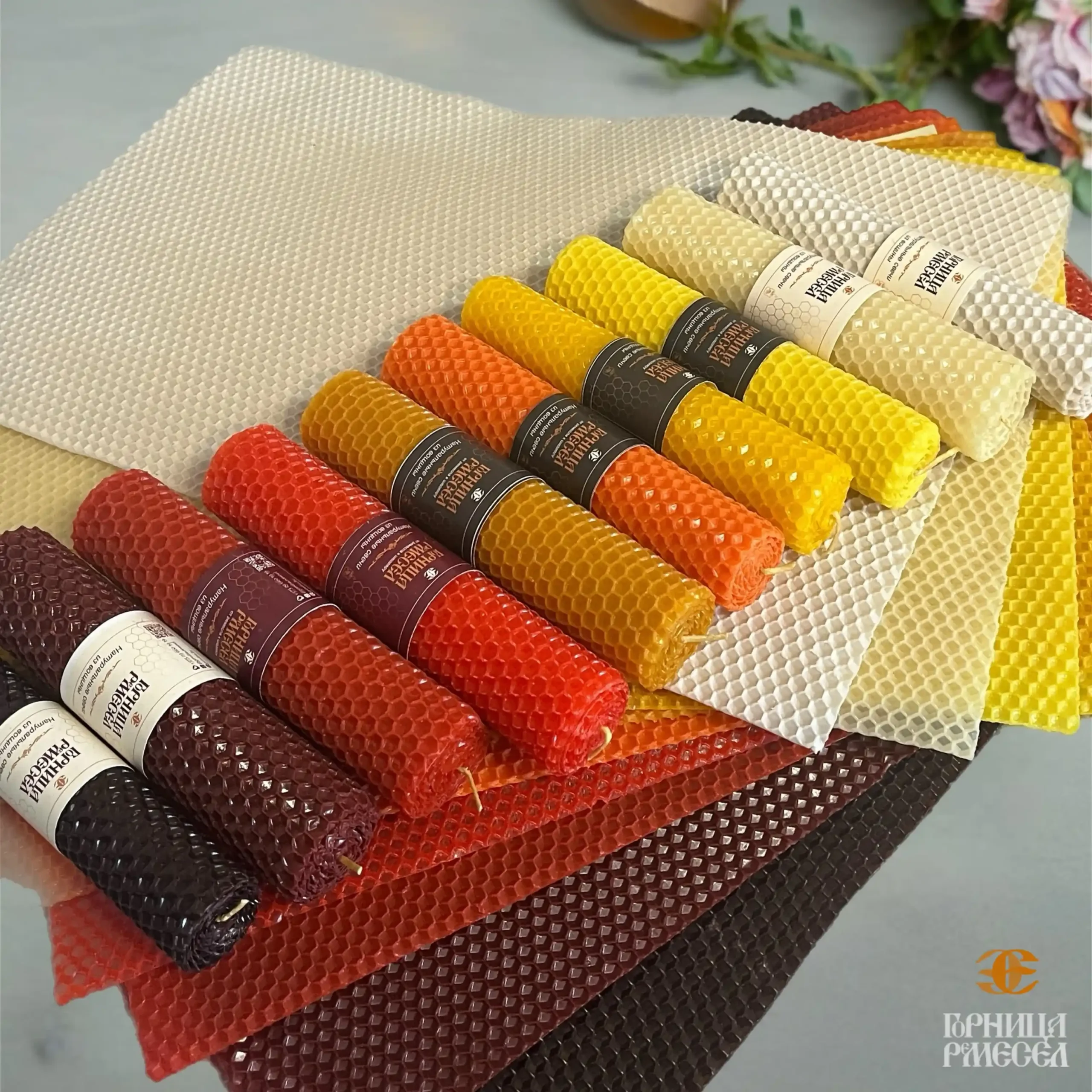 Натуральная вощина «Пряная Горница» для создания уютных свечей: тёплые оттенки от кремового до бордового, медовый аромат, премиальное качество материалов.