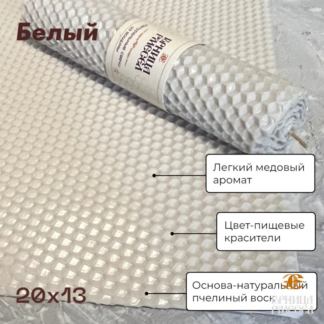 | Состав набора | • 10 листов вощины (20×13 см) • 2 метра вощеного фитиля • Инструкция • Крафтовая упаковка |