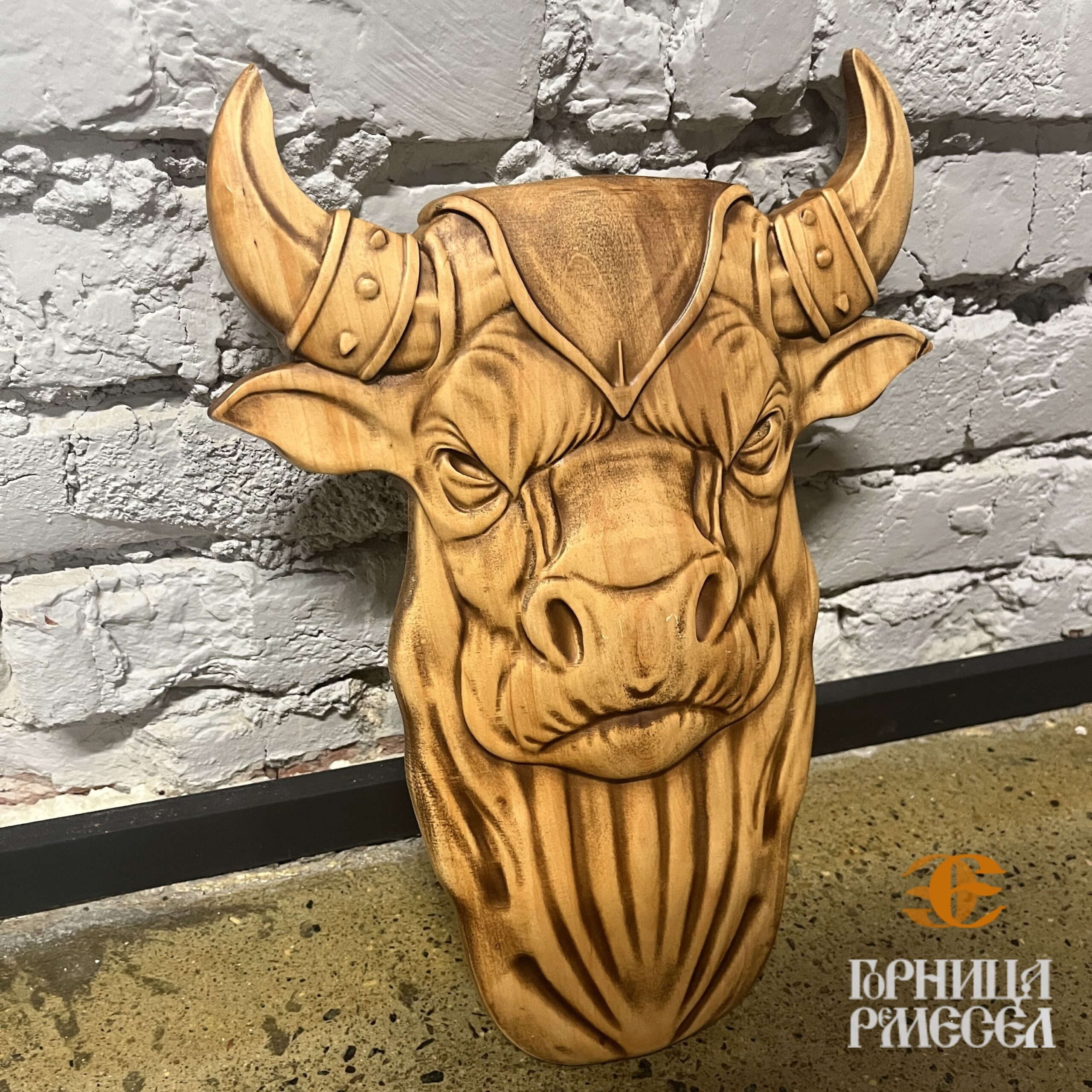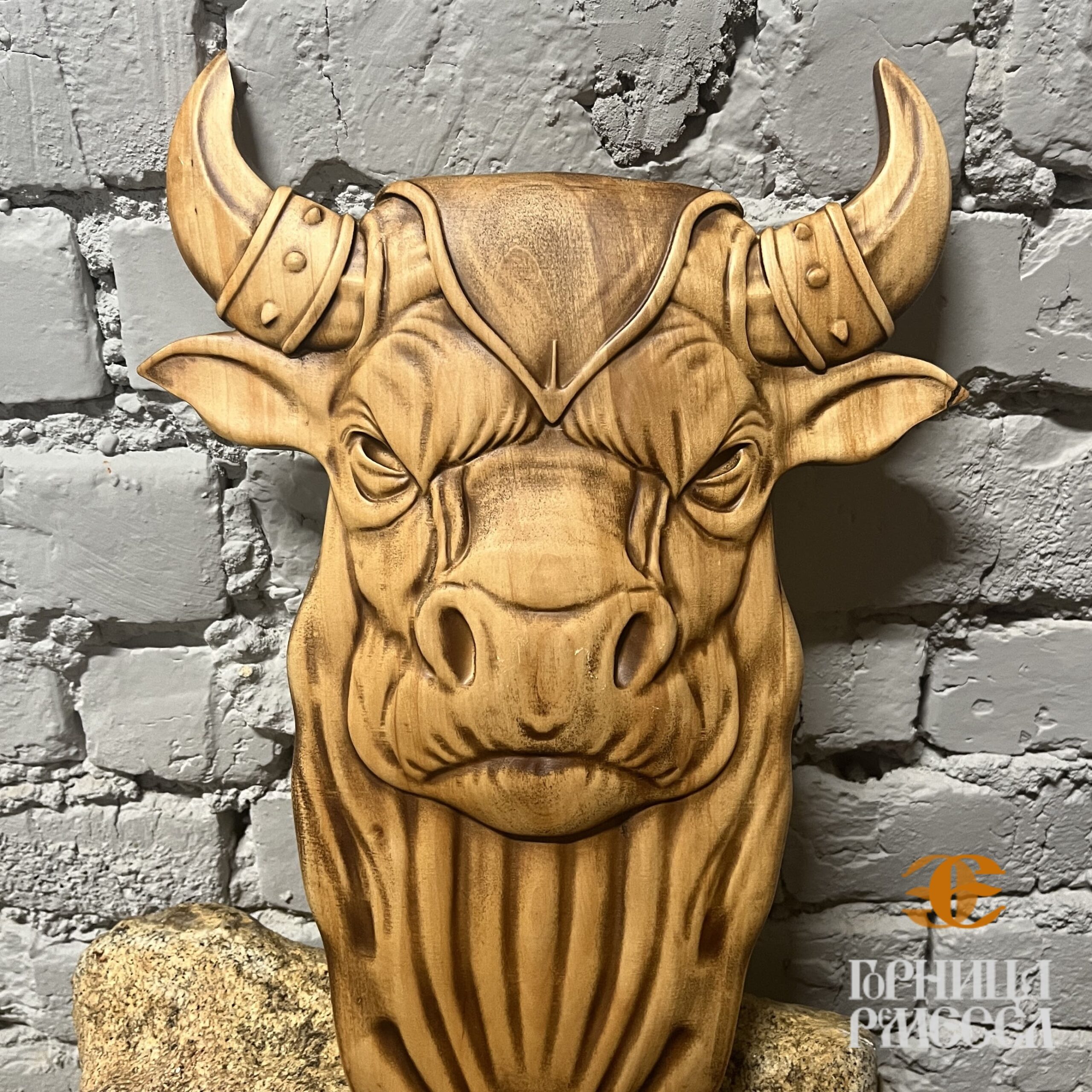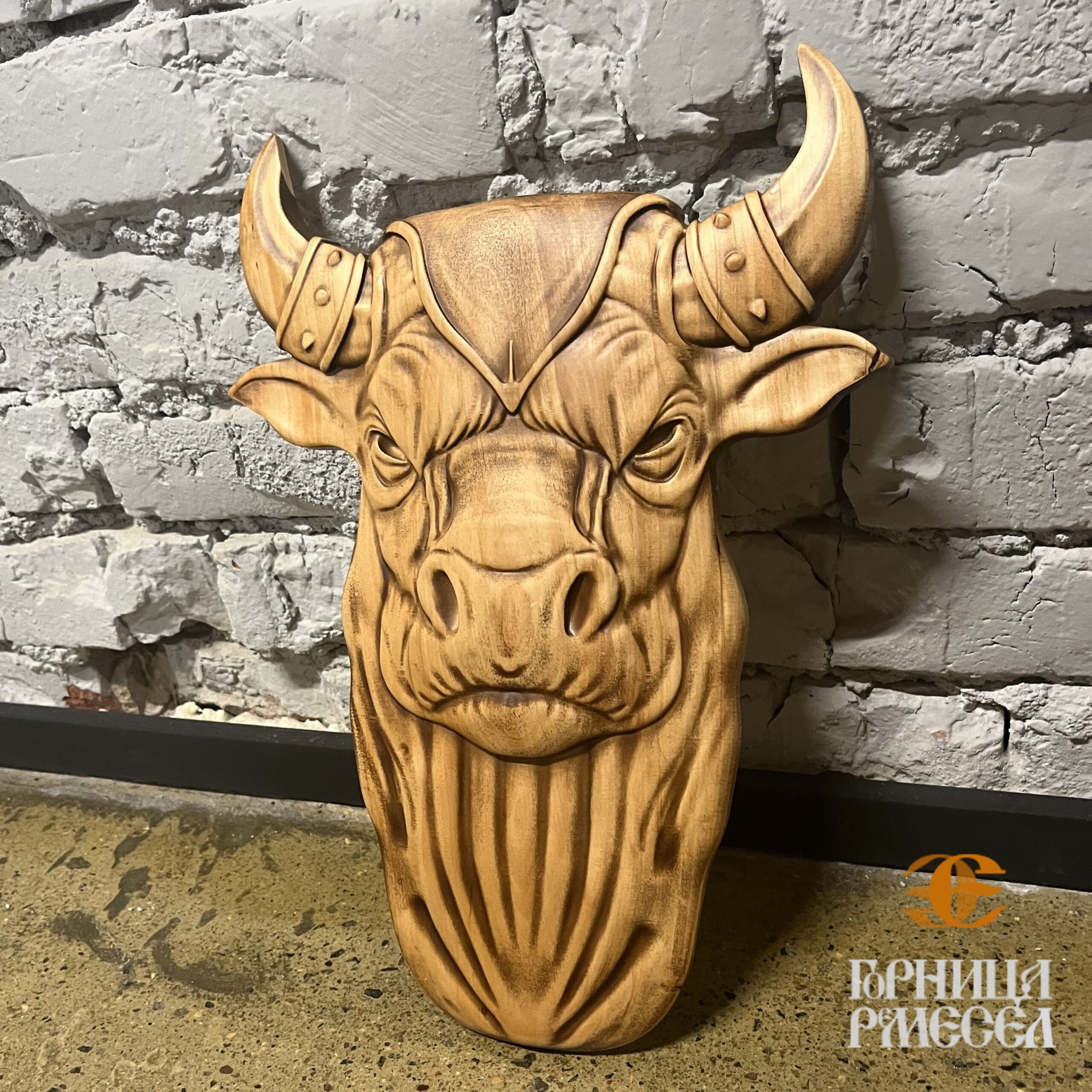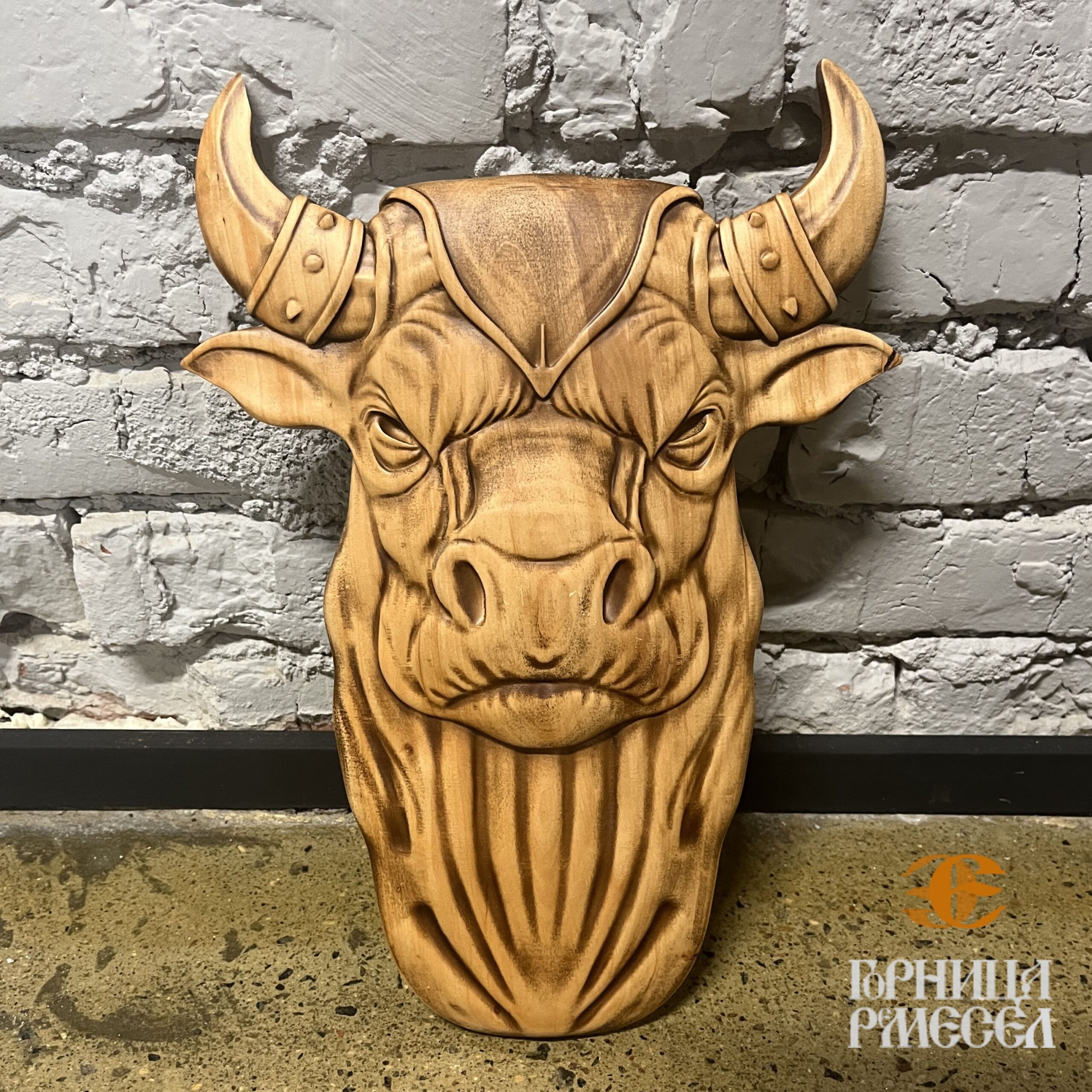 Панно «Бык» — это выразительное декоративное изделие, выполненное мастерами Беларуси из натуральной ольхи. Основа композиции -голова мощного лесного быка, к которым относится национальный символ Беларуси — ЗУБР (Bison bonasus) — дикий лесной бык, символизирующий силу, выносливость и природную энергию. Такое панно особенно актуально как сувенир для туристов, охотников, коллекционеров, а также для оформления интерьеров в этно-стиле, гостиниц, баз отдыха и заповедников. Оно несёт в себе не только художественную, но и культурную ценность, подчёркивая связь с белорусской природой и ремесленной традицией.