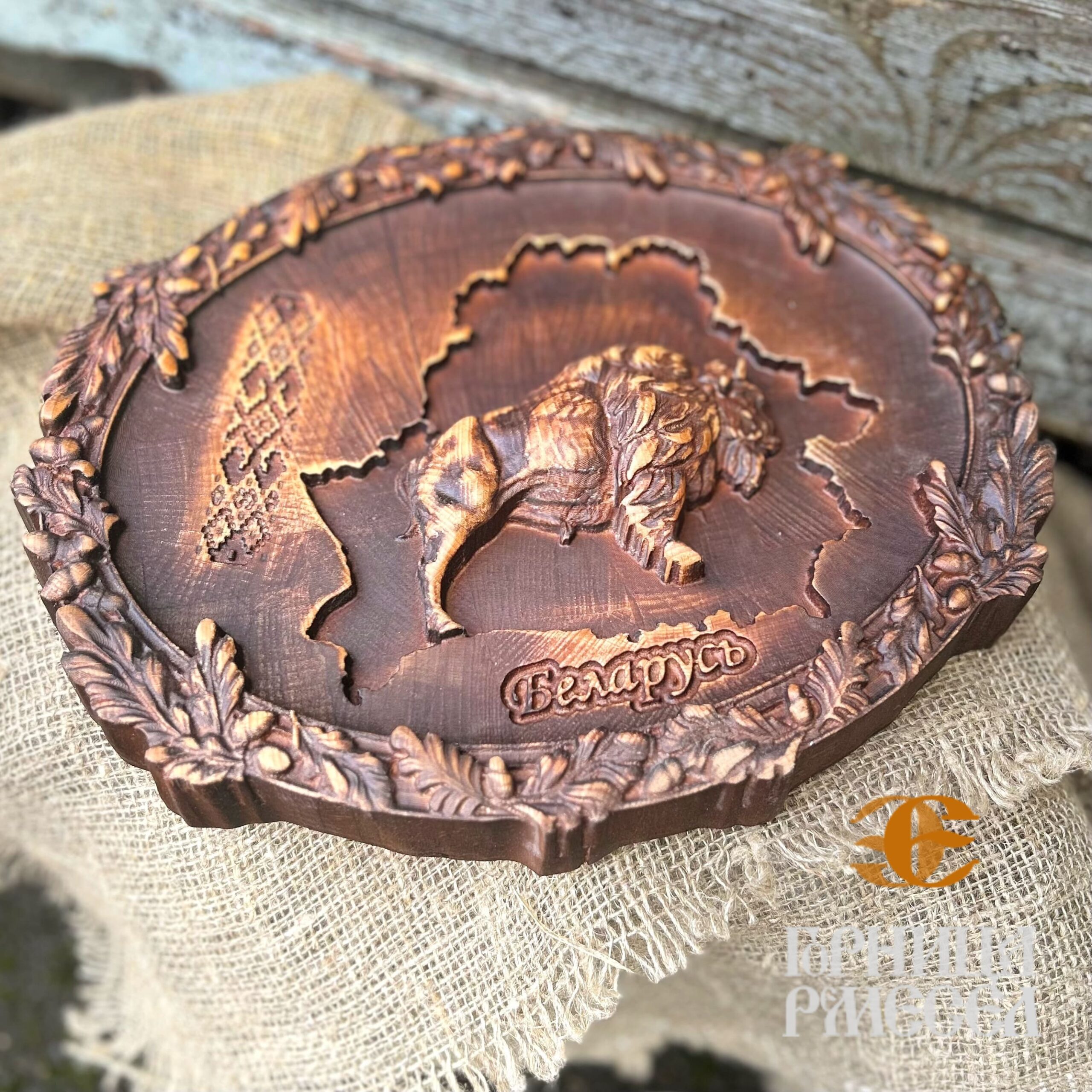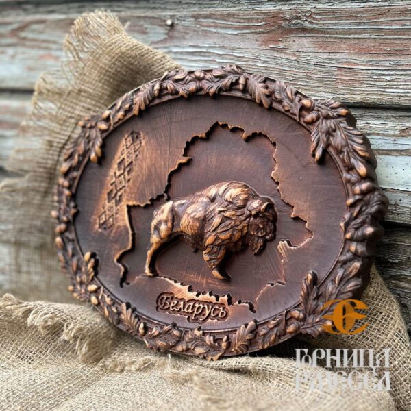 Панно «Зубр» в овальной раме — это эксклюзивное изделие, выполненное из прочного дуба в технике художественной резьбы. Зубр — олицетворение силы, свободы и национального духа, главный символ Беларуси, который с достоинством представит страну в доме, офисе или за границей.