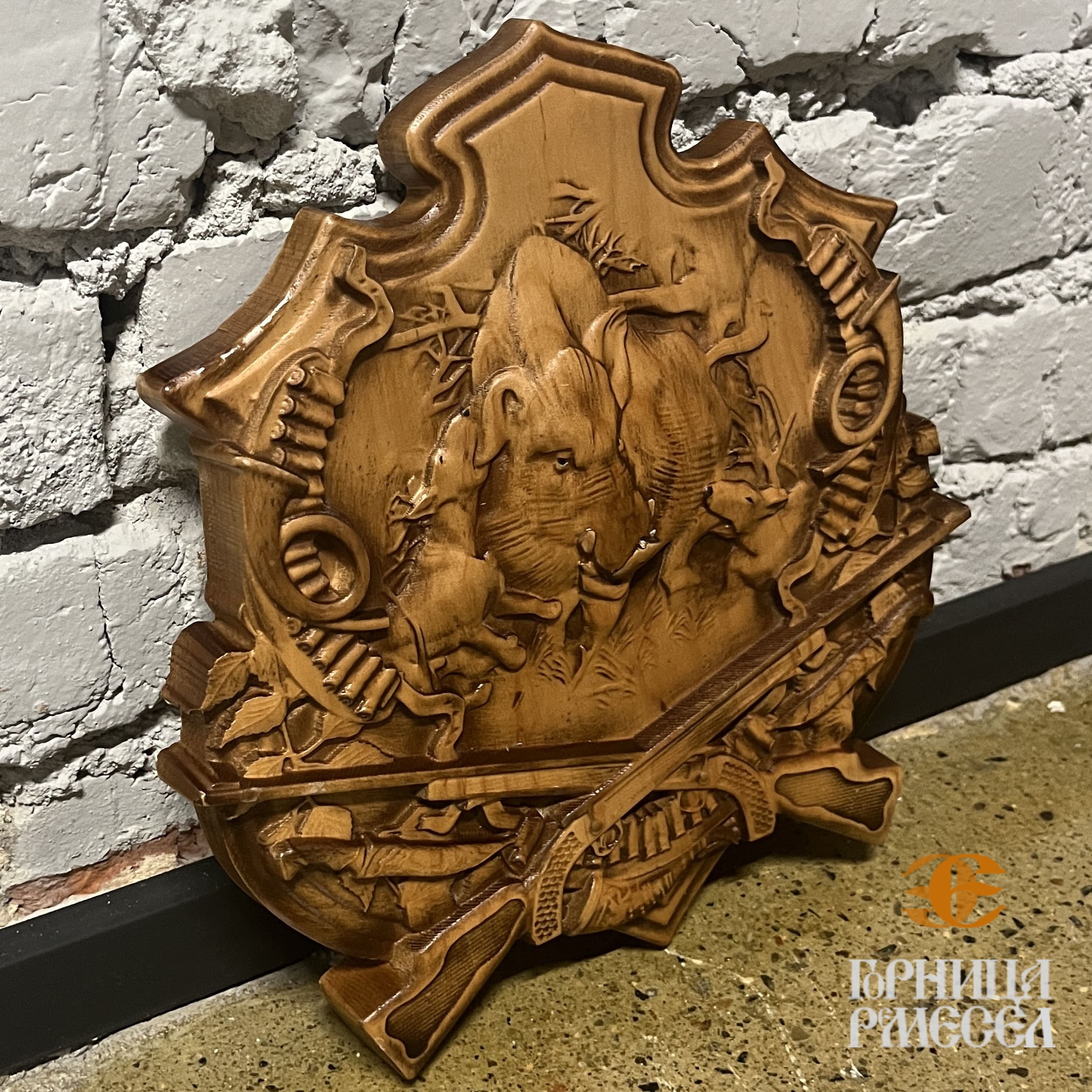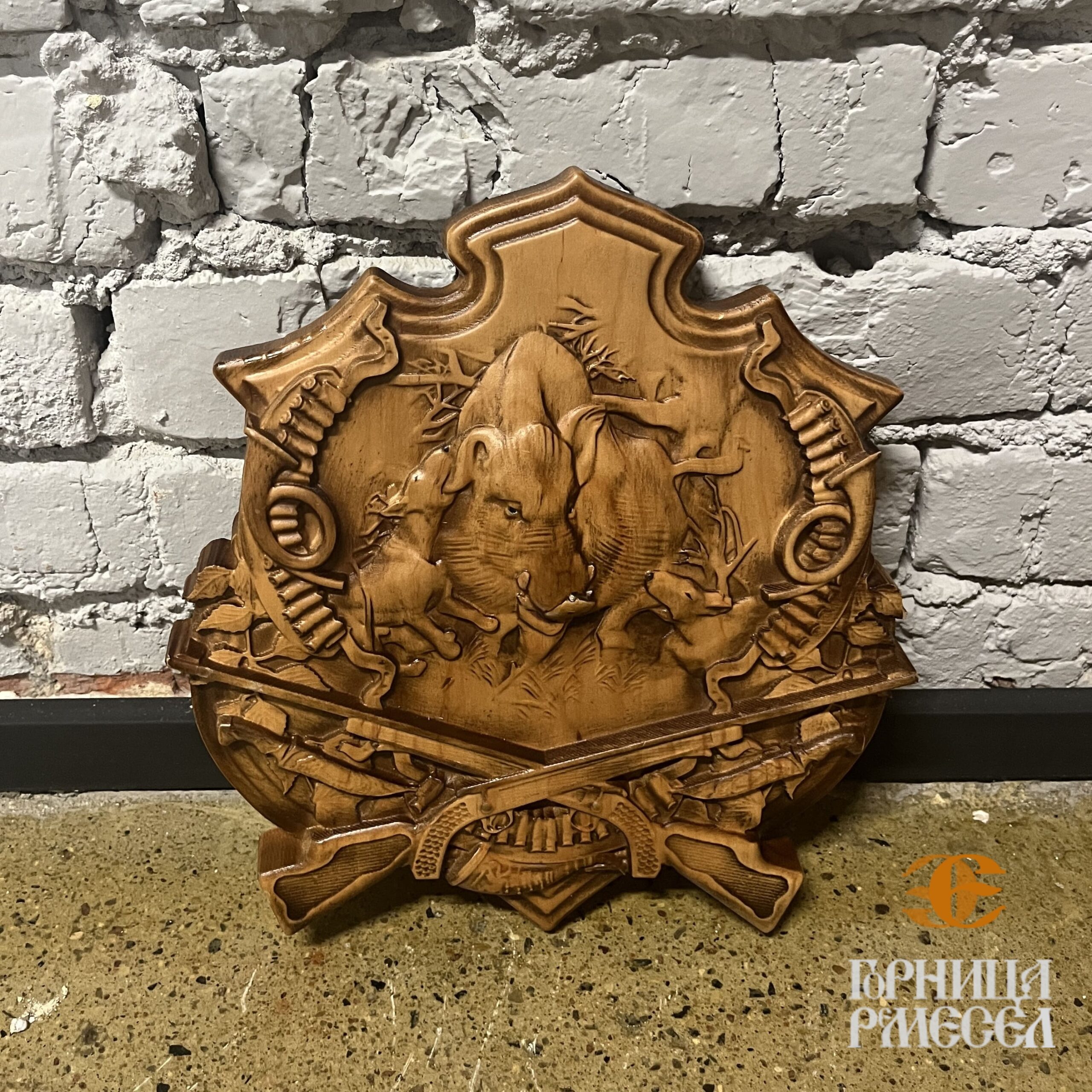 Панно «Кабан, собаки, два ствола» — это декоративное резное изделие, выполненное в виде орнаментального щита. Сцена охоты на кабана с участием собак и охотничьего оружия передана в массиве натуральной ольхи с высокой детализацией. Изготовлено мастерами Беларуси, это панно сочетает в себе художественную выразительность, ремесленную точность и тематическую глубину. Композиция передаёт динамику охоты, уважение к дикой природе и эстетическую глубину, актуальную для ценителей активного отдыха, охотников и гостей заповедных территорий.
