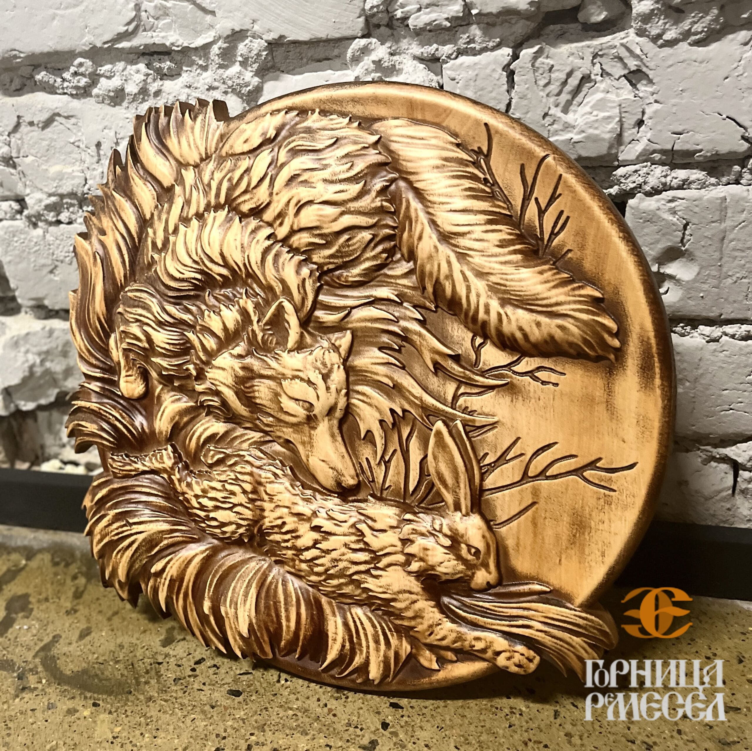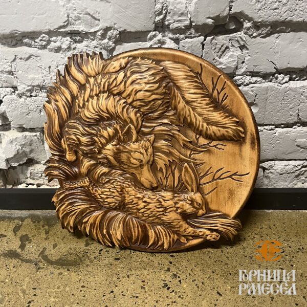 Панно «Лиса и заяц» — это декоративное резное изделие, выполненное в форме круга из массива натуральной ольхи. Композиция изображает динамичную сцену из лесной жизни — хитрая лиса и осторожный заяц, воплощённые в древесной фактуре с высокой детализацией. Изготовлено мастерами Беларуси, это панно сочетает художественную выразительность, ремесленную точность и природную символику.