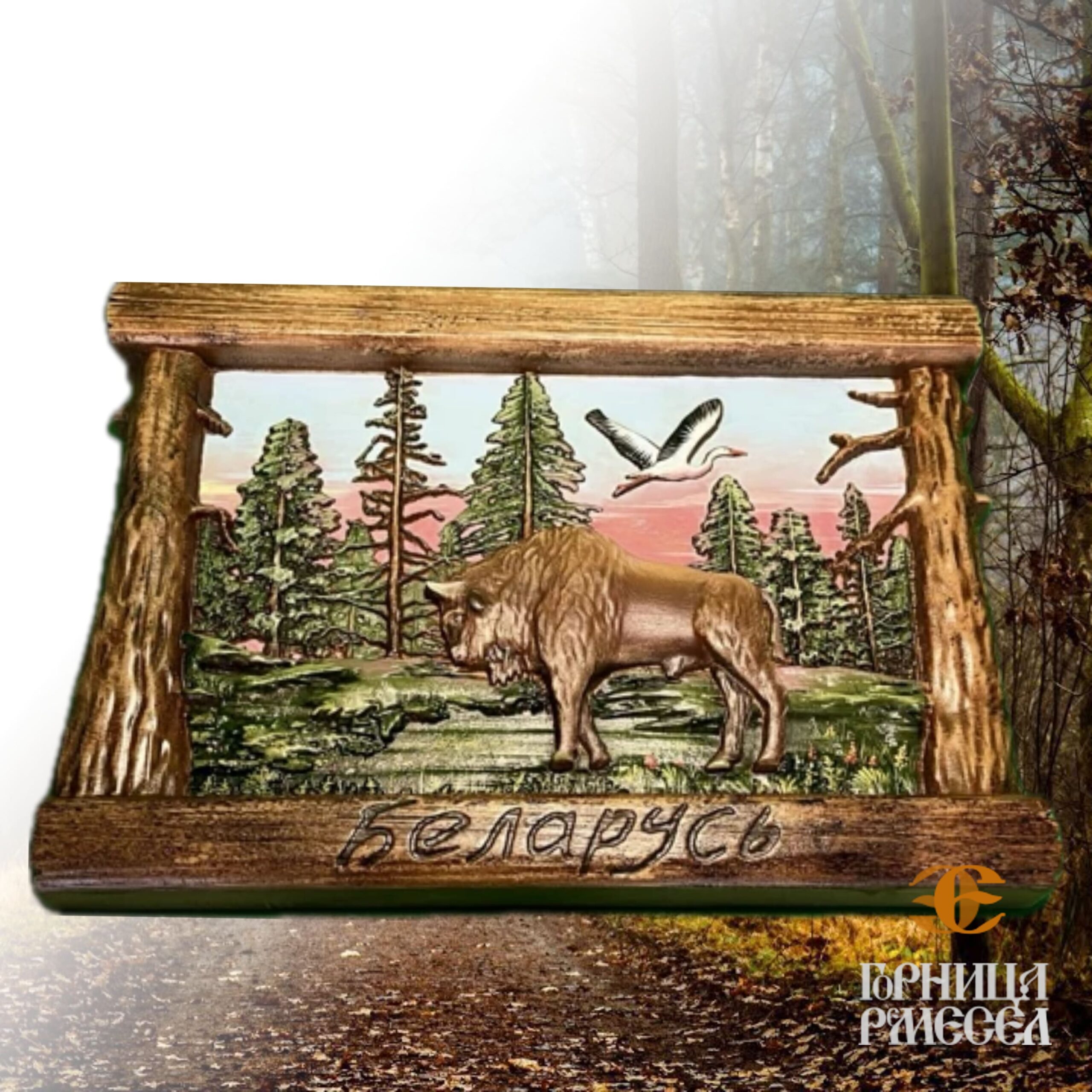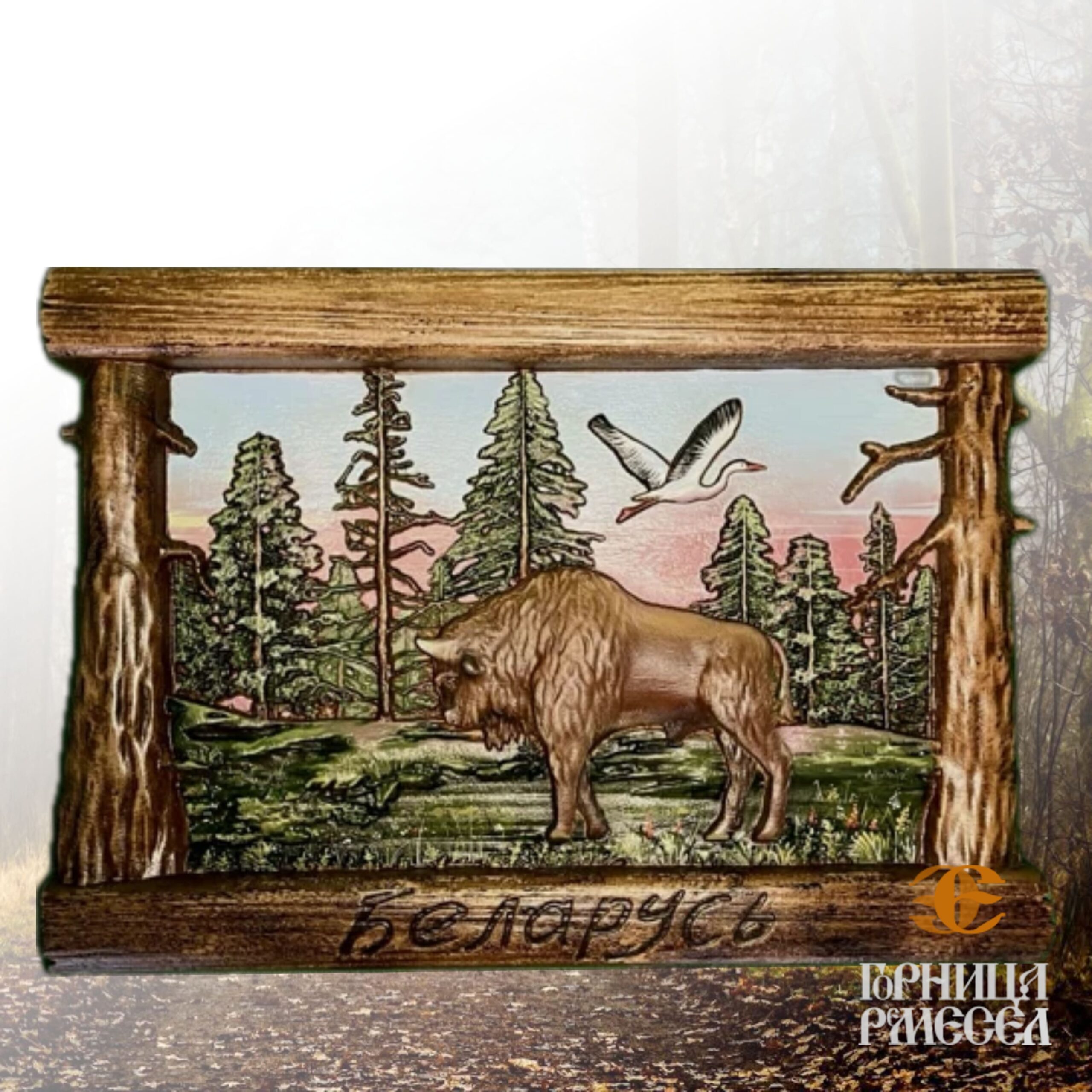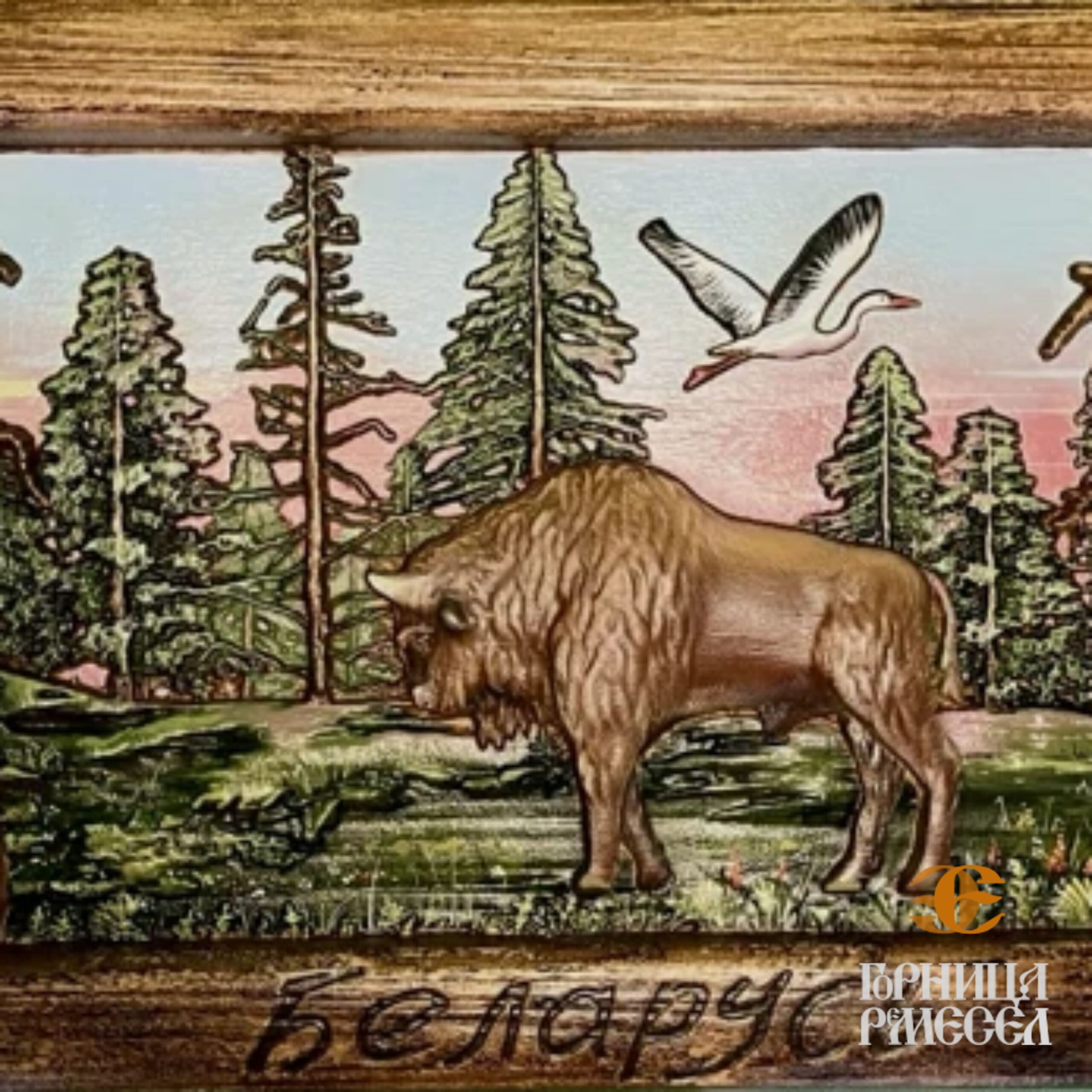 Сюжет: зубр в лесном пейзаже, с летящим аистом и надписью «Беларусь» — символ силы, свободы и природного богатства. Идеально для оформления интерьера в этно-, эко- или рустикальном стиле. Подходит как сувенир, корпоративный подарок или элемент туристической экспозиции. Сохраняет культурную и духовную связь с белорусской землёй.