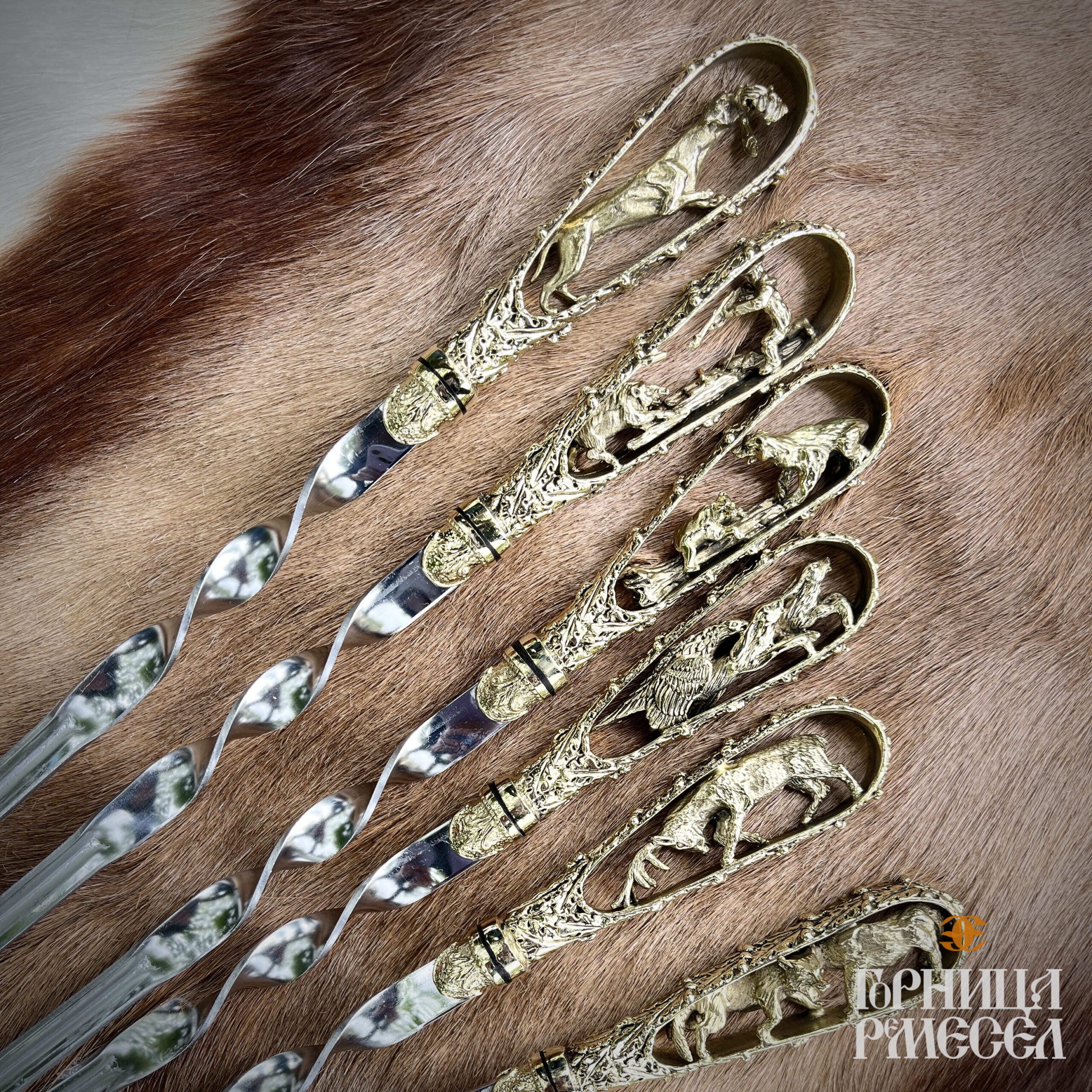 Набор шампуров «Охотничьи трофеи» можно подарить как заядлому охотнику, так и простому ценителю красивых эксклюзивных вещей. Такие шампура не только красивы, но и очень удобны в использовании. Набор всегда пригодится на природе, чтобы приготовить вкусные и полезные блюда — мясо, рыбу, овощи. Набор шампуров «Охотничьи трофеи» – это выбор для ценителей традиций, силы и эстетики охоты. Ручная работа, художественное литье из патинированной латуни, рукояти в виде животных, выполненные из благородных сортов дерева, делают этот комплект не просто инструментом для гриля, а настоящим произведением искусства. Лезвие из пищевой нержавеющей стали гарантирует долговечность и удобство в использовании.