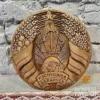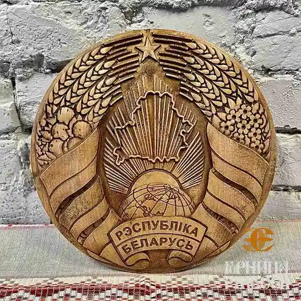Резное изделие из массива ольхи с изображением государственного герба нового образца. Символ национальной гордости и памятный подарок.